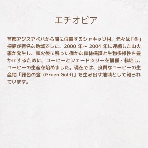 カフェインの抽出後は、3種類のドライヤーを使い分け、ゆっくりと均一に乾燥させていきます。こうした丁寧な後処理が、急激な乾燥による味の劣化を防ぎ、素材の良さが残ったままのデカフェのコーヒーが出来上がります。 エチオピア有数の産地、シダモで生産された明るさと華やかさを持ったコーヒーと、メキシコのオリサバ山の綺麗な水が織りなす、デカフェとは思えないほど上質なデカフェのコーヒーです。